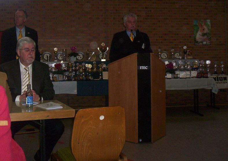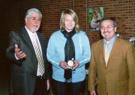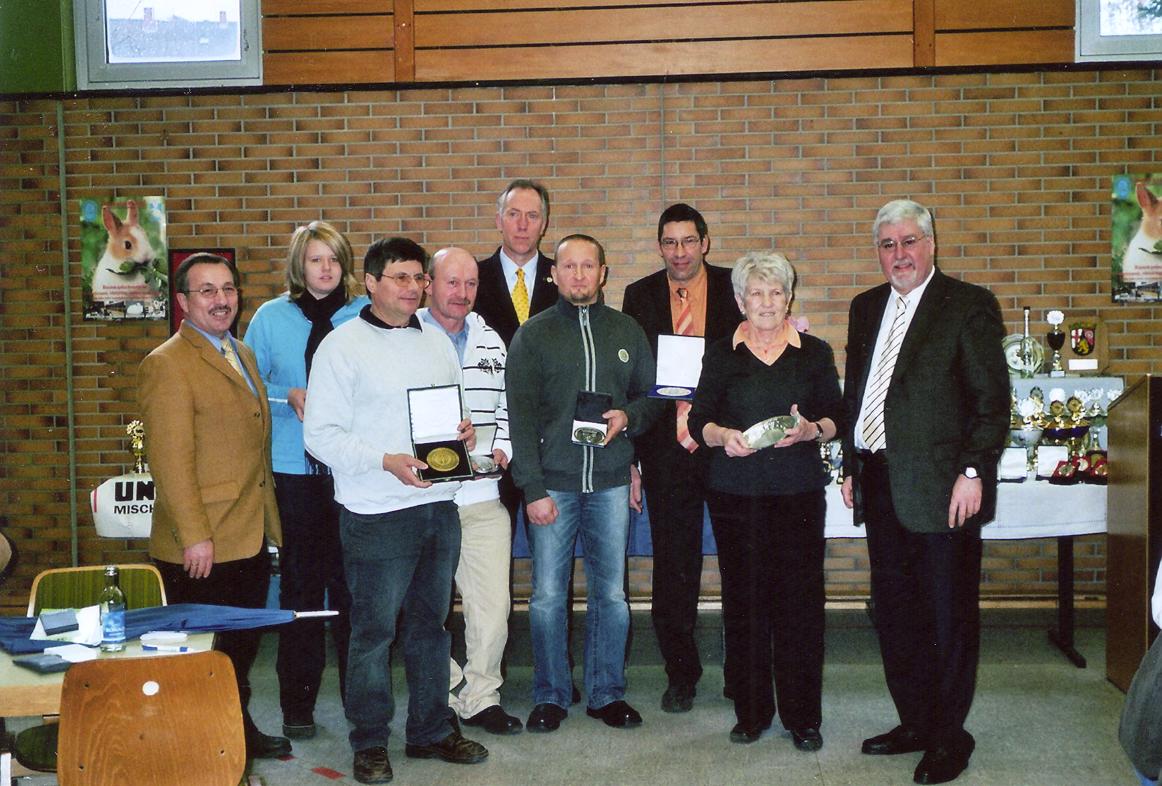 Die erfolgreichsten Aussteller/innen der 47. Landesverbandsschau am 05./06. Januar 2008 in Sohren werden von Joachim Mertes, Landtagspräsident des Landtages von Rheinland-Pfalz, Schirmherr der Schau (rechts) und Rudolf Schneichel (links), Vizepräsident der Landwirtschaftskammer Rheinland-Pfalz, ausgezeichnet. Von links: Sarah Sonnen, Manfred Klose, Friedrich Fuchs, Manfred Grass (Ausstellungsleiter), Christoph Zappe, Klaus Beyer und Erika Lauer